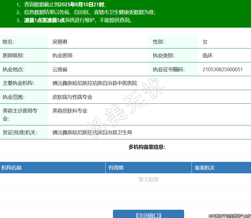 姓名:吳艷琳性別:女醫(yī)師級別:執(zhí)業(yè)醫(yī)師執(zhí)業(yè)類別:臨床執(zhí)業(yè)地點:云南省執(zhí)業(yè)證書編碼:210530825000051主要執(zhí)業(yè)機構:鎮(zhèn)沅彝族哈尼族拉祜族自治縣中醫(yī)醫(yī)院執(zhí)業(yè)范圍:皮膚病與性病專業(yè)美容主診醫(yī)師專業(yè):美容皮膚科專業(yè)發(fā)證(批準)機關:鎮(zhèn)沅彝族哈尼族拉祜族自治縣衛(wèi)生局 -