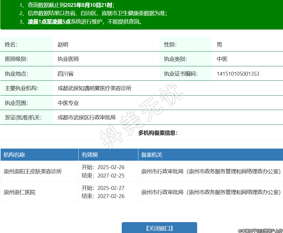 姓名:趙明性別:男醫(yī)師級別:執(zhí)業(yè)醫(yī)師執(zhí)業(yè)類別:中醫(yī)執(zhí)業(yè)地點:四川省執(zhí)業(yè)證書編碼:141510105001353主要執(zhí)業(yè)機構:成都武侯知遇明夏醫(yī)療美容診所執(zhí)業(yè)范圍:中醫(yī)專業(yè)發(fā)證(批準)機關:成都市武侯區(qū)行政審批局多機構備案信息:機構名稱 有效期 備案機關 崇州崇陽王皮膚美容診所 開始:2025-02-26結束:2027-02-25崇州市行政審批局(崇州市政務服務管理和網絡理政辦公室) 崇州崇仁醫(yī)院 開始:2025-02-27結束:2027-02-26崇州市行政審批局(崇州市政務服務管理和網絡理政辦公室) -