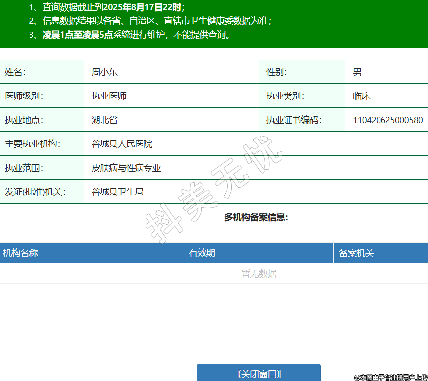 姓名:周小東性別:男醫(yī)師級別:執(zhí)業(yè)醫(yī)師執(zhí)業(yè)類別:臨床執(zhí)業(yè)地點:湖北省執(zhí)業(yè)證書編碼:110420625000580主要執(zhí)業(yè)機構(gòu):谷城縣人民醫(yī)院執(zhí)業(yè)范圍:皮膚病與性病專業(yè)發(fā)證(批準)機關(guān):谷城縣衛(wèi)生局 -