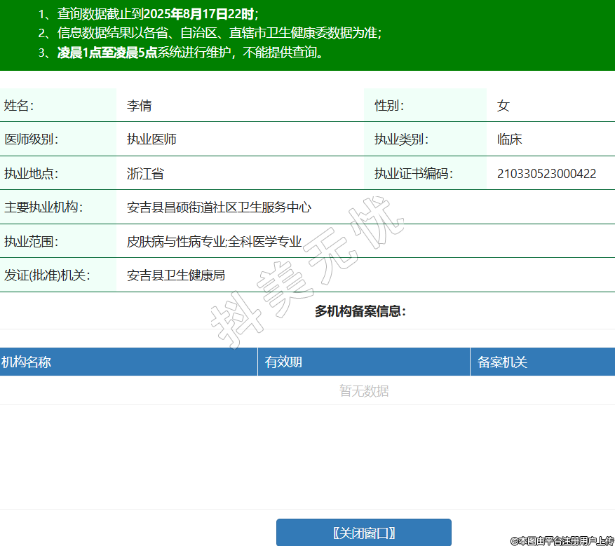 姓名:李倩性別:女醫(yī)師級(jí)別:執(zhí)業(yè)醫(yī)師執(zhí)業(yè)類(lèi)別:臨床執(zhí)業(yè)地點(diǎn):浙江省執(zhí)業(yè)證書(shū)編碼:210330523000422主要執(zhí)業(yè)機(jī)構(gòu):安吉縣昌碩街道社區(qū)衛(wèi)生服務(wù)中心執(zhí)業(yè)范圍:皮膚病與性病專(zhuān)業(yè);全科醫(yī)學(xué)專(zhuān)業(yè)發(fā)證(批準(zhǔn))機(jī)關(guān):安吉縣衛(wèi)生健康局 -