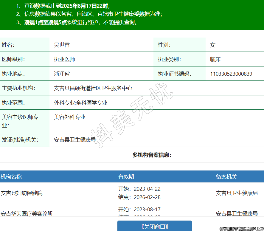 姓名:吳世雷性別:女醫(yī)師級(jí)別:執(zhí)業(yè)醫(yī)師執(zhí)業(yè)類(lèi)別:臨床執(zhí)業(yè)地點(diǎn):浙江省執(zhí)業(yè)證書(shū)編碼:110330523000839主要執(zhí)業(yè)機(jī)構(gòu):安吉縣昌碩街道社區(qū)衛(wèi)生服務(wù)中心執(zhí)業(yè)范圍:外科專(zhuān)業(yè);全科醫(yī)學(xué)專(zhuān)業(yè)美容主診醫(yī)師專(zhuān)業(yè):美容外科專(zhuān)業(yè)發(fā)證(批準(zhǔn))機(jī)關(guān):安吉縣衛(wèi)生健康局多機(jī)構(gòu)備案信息:機(jī)構(gòu)名稱(chēng) 有效期 備案機(jī)關(guān) 安吉縣婦幼保健院 開(kāi)始:2023-04-22結(jié)束:2026-02-28安吉縣衛(wèi)生健康局 安吉華芙醫(yī)療美容診所 開(kāi)始:2023-08-17結(jié)束:2026-08-03安吉縣衛(wèi)生健康局 安吉新顏醫(yī)療美容診所 開(kāi)始:2024-11-28結(jié)束:2027-11-27安吉縣衛(wèi)生健康局 -