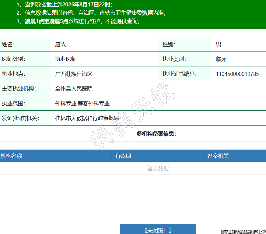 姓名:唐政性別:男醫(yī)師級(jí)別:執(zhí)業(yè)醫(yī)師執(zhí)業(yè)類(lèi)別:臨床執(zhí)業(yè)地點(diǎn):廣西壯族自治區(qū)執(zhí)業(yè)證書(shū)編碼:110450000019785主要執(zhí)業(yè)機(jī)構(gòu):全州縣人民醫(yī)院執(zhí)業(yè)范圍:外科專(zhuān)業(yè);美容外科專(zhuān)業(yè)發(fā)證(批準(zhǔn))機(jī)關(guān):桂林市大數(shù)據(jù)和行政審批局 -
