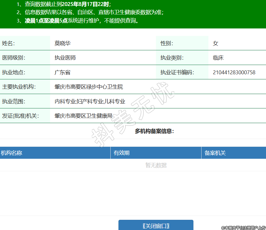 姓名:莫曉華性別:女醫(yī)師級(jí)別:執(zhí)業(yè)醫(yī)師執(zhí)業(yè)類別:臨床執(zhí)業(yè)地點(diǎn):廣東省執(zhí)業(yè)證書編碼:210441283000758主要執(zhí)業(yè)機(jī)構(gòu):肇慶市高要區(qū)祿步中心衛(wèi)生院執(zhí)業(yè)范圍:內(nèi)科專業(yè);婦產(chǎn)科專業(yè);兒科專業(yè)發(fā)證(批準(zhǔn))機(jī)關(guān):肇慶市高要區(qū)衛(wèi)生健康局 -