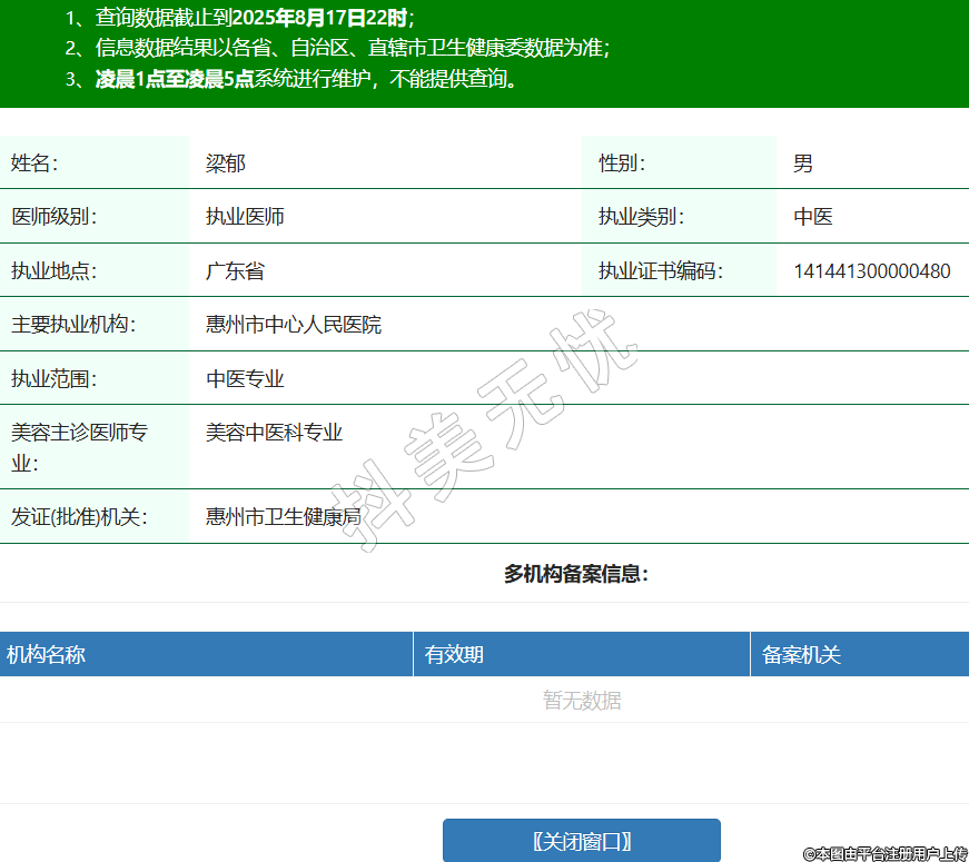 姓名:梁郁性別:男醫(yī)師級別:執(zhí)業(yè)醫(yī)師執(zhí)業(yè)類別:中醫(yī)執(zhí)業(yè)地點(diǎn):廣東省執(zhí)業(yè)證書編碼:141441300000480主要執(zhí)業(yè)機(jī)構(gòu):惠州市中心人民醫(yī)院執(zhí)業(yè)范圍:中醫(yī)專業(yè)美容主診醫(yī)師專業(yè):美容中醫(yī)科專業(yè)發(fā)證(批準(zhǔn))機(jī)關(guān):惠州市衛(wèi)生健康局 -