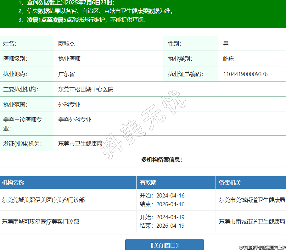 姓名:歐翰杰性別:男醫(yī)師級別:執(zhí)業(yè)醫(yī)師執(zhí)業(yè)類別:臨床執(zhí)業(yè)地點(diǎn):廣東省執(zhí)業(yè)證書編碼:110441900009376主要執(zhí)業(yè)機(jī)構(gòu):東莞市松山湖中心醫(yī)院執(zhí)業(yè)范圍:外科專業(yè)美容主診醫(yī)師專業(yè):美容外科專業(yè)發(fā)證(批準(zhǔn))機(jī)關(guān):東莞市衛(wèi)生健康局多機(jī)構(gòu)備案信息:機(jī)構(gòu)名稱 有效期 備案機(jī)關(guān) 東莞莞城美熙伊美醫(yī)療美容門診部 開始:2024-04-16結(jié)束:2026-04-16東莞市莞城街道衛(wèi)生健康局 東莞南城可玫爾醫(yī)療美容門診部 開始:2024-04-19結(jié)束:2026-04-19東莞市南城街道衛(wèi)生健康局 -