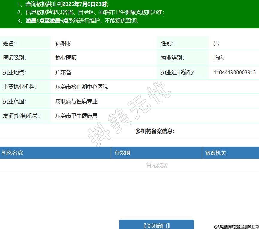 姓名:孫澍彬性別:男醫(yī)師級別:執(zhí)業(yè)醫(yī)師執(zhí)業(yè)類別:臨床執(zhí)業(yè)地點:廣東省執(zhí)業(yè)證書編碼:110441900003913主要執(zhí)業(yè)機構:東莞市松山湖中心醫(yī)院執(zhí)業(yè)范圍:皮膚病與性病專業(yè)發(fā)證(批準)機關:東莞市衛(wèi)生健康局 -