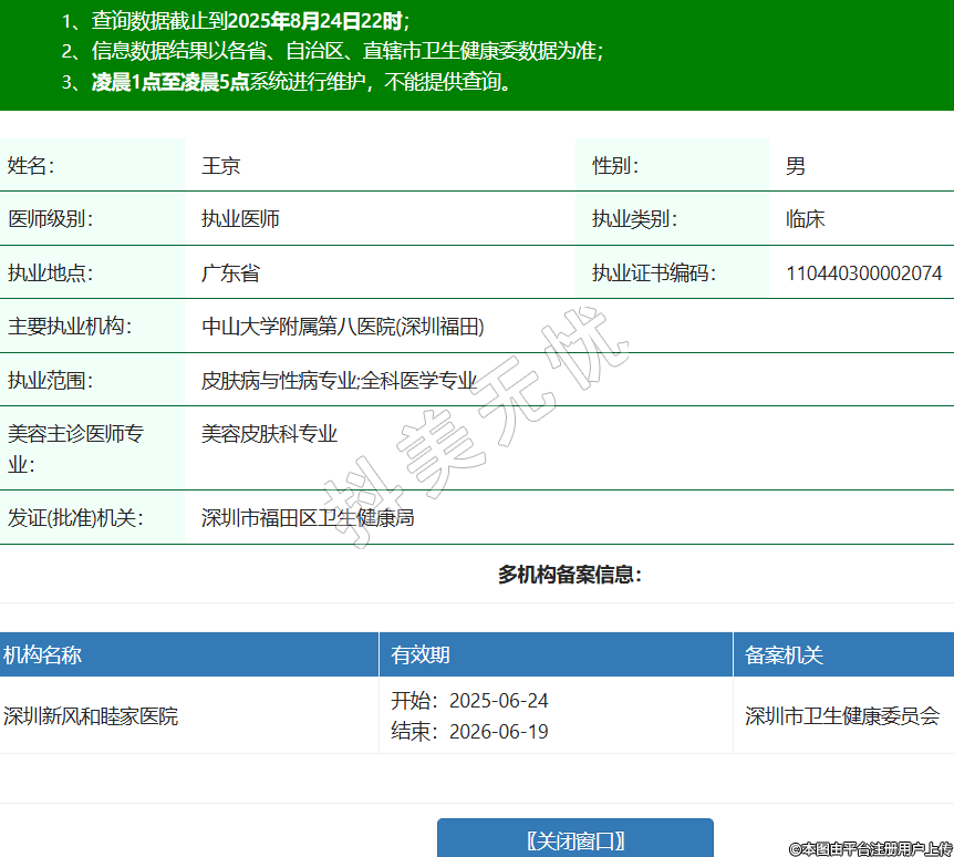 姓名:王京性別:男醫(yī)師級別:執(zhí)業(yè)醫(yī)師執(zhí)業(yè)類別:臨床執(zhí)業(yè)地點(diǎn):廣東省執(zhí)業(yè)證書編碼:110440300002074主要執(zhí)業(yè)機(jī)構(gòu):中山大學(xué)附屬第八醫(yī)院(深圳福田)執(zhí)業(yè)范圍:皮膚病與性病專業(yè);全科醫(yī)學(xué)專業(yè)美容主診醫(yī)師專業(yè):美容皮膚科專業(yè)發(fā)證(批準(zhǔn))機(jī)關(guān):深圳市福田區(qū)衛(wèi)生健康局多機(jī)構(gòu)備案信息:機(jī)構(gòu)名稱 有效期 備案機(jī)關(guān) 深圳新風(fēng)和睦家醫(yī)院 開始:2025-06-24結(jié)束:2026-06-19深圳市衛(wèi)生健康委員會 -