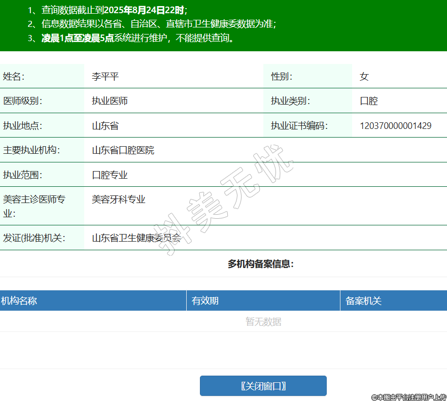 姓名:李平平性別:女醫(yī)師級別:執(zhí)業(yè)醫(yī)師執(zhí)業(yè)類別:口腔執(zhí)業(yè)地點:山東省執(zhí)業(yè)證書編碼:120370000001429主要執(zhí)業(yè)機構:山東省口腔醫(yī)院執(zhí)業(yè)范圍:口腔專業(yè)美容主診醫(yī)師專業(yè):美容牙科專業(yè)發(fā)證(批準)機關:山東省衛(wèi)生健康委員會 -