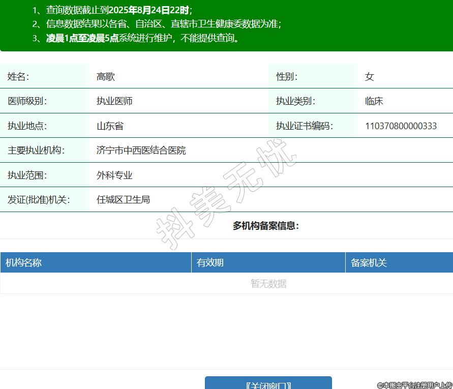 姓名:高歌性別:女醫(yī)師級(jí)別:執(zhí)業(yè)醫(yī)師執(zhí)業(yè)類別:臨床執(zhí)業(yè)地點(diǎn):山東省執(zhí)業(yè)證書(shū)編碼:110370800000333主要執(zhí)業(yè)機(jī)構(gòu):濟(jì)寧市中西醫(yī)結(jié)合醫(yī)院執(zhí)業(yè)范圍:外科專業(yè)發(fā)證(批準(zhǔn))機(jī)關(guān):任城區(qū)衛(wèi)生局 -