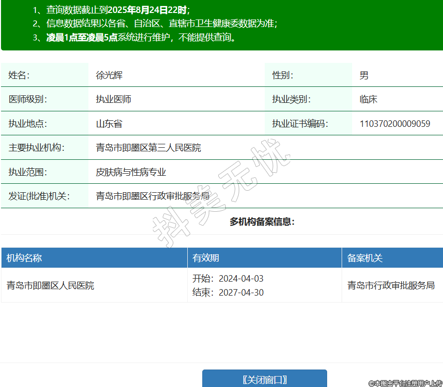 姓名:徐光輝性別:男醫(yī)師級別:執(zhí)業(yè)醫(yī)師執(zhí)業(yè)類別:臨床執(zhí)業(yè)地點:山東省執(zhí)業(yè)證書編碼:110370200009059主要執(zhí)業(yè)機構(gòu):青島市即墨區(qū)第三人民醫(yī)院執(zhí)業(yè)范圍:皮膚病與性病專業(yè)發(fā)證(批準)機關(guān):青島市即墨區(qū)行政審批服務(wù)局多機構(gòu)備案信息:機構(gòu)名稱 有效期 備案機關(guān) 青島市即墨區(qū)人民醫(yī)院 開始:2024-04-03結(jié)束:2027-04-30青島市行政審批服務(wù)局 -