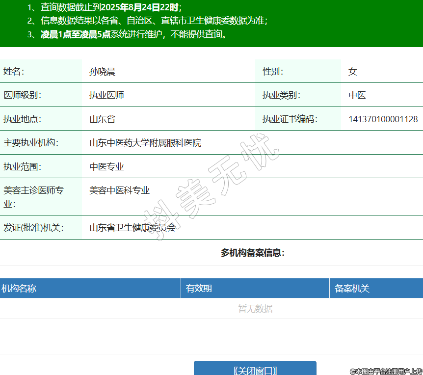 姓名:孫曉晨性別:女醫(yī)師級別:執(zhí)業(yè)醫(yī)師執(zhí)業(yè)類別:中醫(yī)執(zhí)業(yè)地點:山東省執(zhí)業(yè)證書編碼:141370100001128主要執(zhí)業(yè)機構:山東中醫(yī)藥大學附屬眼科醫(yī)院執(zhí)業(yè)范圍:中醫(yī)專業(yè)美容主診醫(yī)師專業(yè):美容中醫(yī)科專業(yè)發(fā)證(批準)機關:山東省衛(wèi)生健康委員會 -