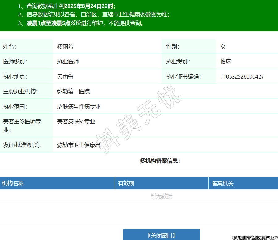 姓名:楊麗芳性別:女醫(yī)師級別:執(zhí)業(yè)醫(yī)師執(zhí)業(yè)類別:臨床執(zhí)業(yè)地點:云南省執(zhí)業(yè)證書編碼:110532526000427主要執(zhí)業(yè)機構(gòu):彌勒第一醫(yī)院執(zhí)業(yè)范圍:皮膚病與性病專業(yè)美容主診醫(yī)師專業(yè):美容皮膚科專業(yè)發(fā)證(批準(zhǔn))機關(guān):彌勒市衛(wèi)生健康局 -