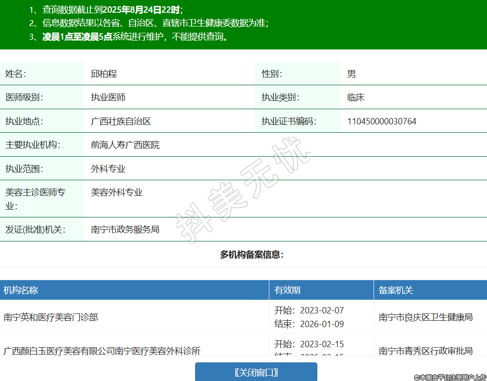 姓名:邱柏程性別:男醫(yī)師級(jí)別:執(zhí)業(yè)醫(yī)師執(zhí)業(yè)類別:臨床執(zhí)業(yè)地點(diǎn):廣西壯族自治區(qū)執(zhí)業(yè)證書編碼:110450000030764主要執(zhí)業(yè)機(jī)構(gòu):前海人壽廣西醫(yī)院執(zhí)業(yè)范圍:外科專業(yè)美容主診醫(yī)師專業(yè):美容外科專業(yè)發(fā)證(批準(zhǔn))機(jī)關(guān):南寧市政務(wù)服務(wù)局多機(jī)構(gòu)備案信息:機(jī)構(gòu)名稱 有效期 備案機(jī)關(guān) 南寧英和醫(yī)療美容門診部 開始:2023-02-07結(jié)束:2026-01-09南寧市良慶區(qū)衛(wèi)生健康局 廣西顏白玉醫(yī)療美容有限公司南寧醫(yī)療美容外科診所 開始:2023-02-15結(jié)束:2026-03-15南寧市青秀區(qū)行政審批局 南寧梵容整形醫(yī)療美容門診有限公司醫(yī)療美容診所 開始:2023-06-05結(jié)束:2026-06-04南寧市青秀區(qū)行政審批局 南寧馥顏醫(yī)療管理有限責(zé)任公司醫(yī)療美容外科診所 開始:2024-07-27結(jié)束:2029-07-26南寧市青秀區(qū)行政審批局 柳州柏麗醫(yī)療美容診所 開始:2024-09-17結(jié)束:2029-09-16柳州市柳北區(qū)衛(wèi)生健康局 -