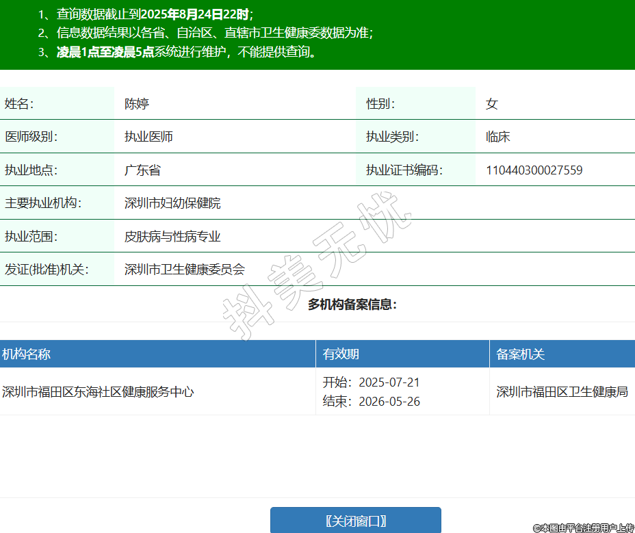姓名:陳婷性別:女醫(yī)師級(jí)別:執(zhí)業(yè)醫(yī)師執(zhí)業(yè)類別:臨床執(zhí)業(yè)地點(diǎn):廣東省執(zhí)業(yè)證書編碼:110440300027559主要執(zhí)業(yè)機(jī)構(gòu):深圳市婦幼保健院執(zhí)業(yè)范圍:皮膚病與性病專業(yè)發(fā)證(批準(zhǔn))機(jī)關(guān):深圳市衛(wèi)生健康委員會(huì)多機(jī)構(gòu)備案信息:機(jī)構(gòu)名稱 有效期 備案機(jī)關(guān) 深圳市福田區(qū)東海社區(qū)健康服務(wù)中心 開始:2025-07-21結(jié)束:2026-05-26深圳市福田區(qū)衛(wèi)生健康局 -
