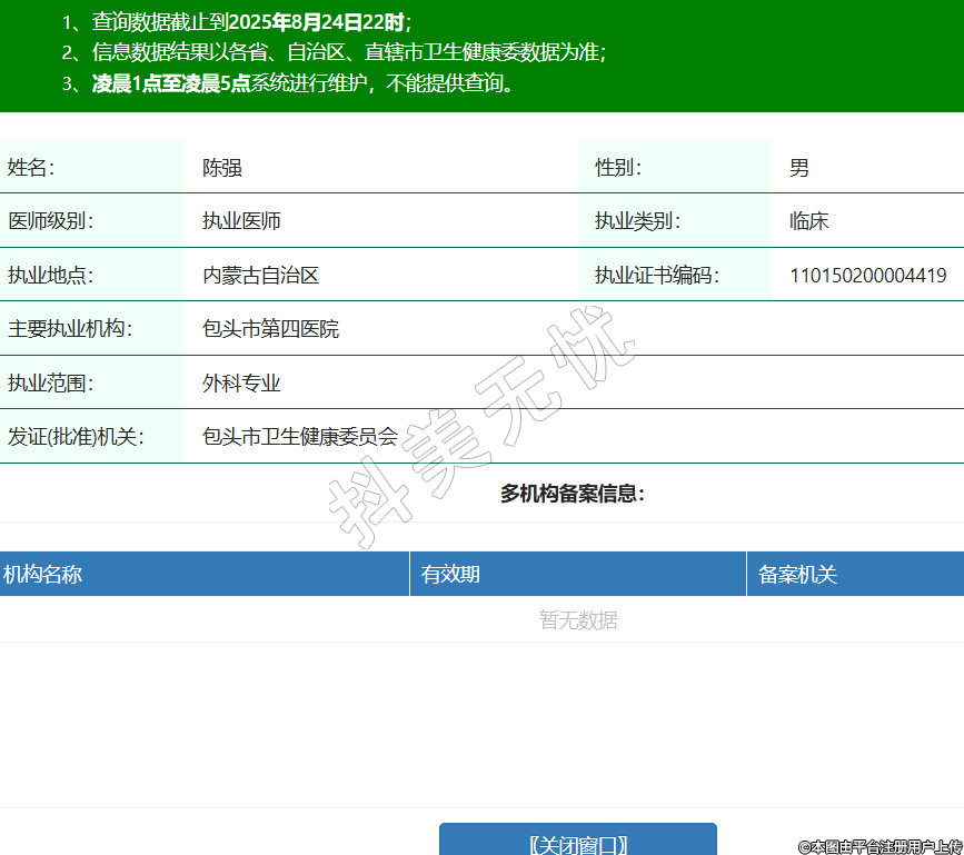 姓名:陳強(qiáng)性別:男醫(yī)師級別:執(zhí)業(yè)醫(yī)師執(zhí)業(yè)類別:臨床執(zhí)業(yè)地點(diǎn):內(nèi)蒙古自治區(qū)執(zhí)業(yè)證書編碼:110150200004419主要執(zhí)業(yè)機(jī)構(gòu):包頭市第四醫(yī)院執(zhí)業(yè)范圍:外科專業(yè)發(fā)證(批準(zhǔn))機(jī)關(guān):包頭市衛(wèi)生健康委員會 -
