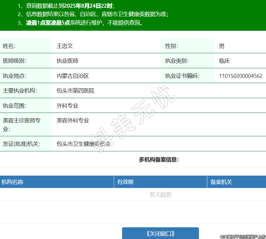姓名:王忠文性別:男醫(yī)師級(jí)別:執(zhí)業(yè)醫(yī)師執(zhí)業(yè)類別:臨床執(zhí)業(yè)地點(diǎn):內(nèi)蒙古自治區(qū)執(zhí)業(yè)證書編碼:110150200004562主要執(zhí)業(yè)機(jī)構(gòu):包頭市第四醫(yī)院執(zhí)業(yè)范圍:外科專業(yè)美容主診醫(yī)師專業(yè):美容外科專業(yè)發(fā)證(批準(zhǔn))機(jī)關(guān):包頭市衛(wèi)生健康委員會(huì) -