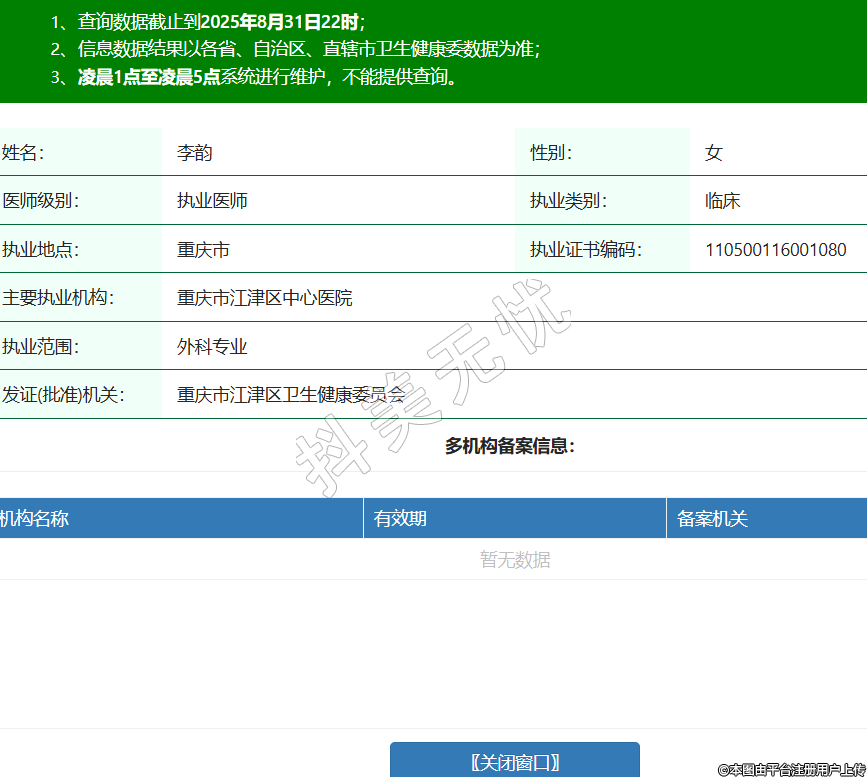 姓名:李韻性別:女醫(yī)師級(jí)別:執(zhí)業(yè)醫(yī)師執(zhí)業(yè)類(lèi)別:臨床執(zhí)業(yè)地點(diǎn):重慶市執(zhí)業(yè)證書(shū)編碼:110500116001080主要執(zhí)業(yè)機(jī)構(gòu):重慶市江津區(qū)中心醫(yī)院執(zhí)業(yè)范圍:外科專(zhuān)業(yè)發(fā)證(批準(zhǔn))機(jī)關(guān):重慶市江津區(qū)衛(wèi)生健康委員會(huì) -