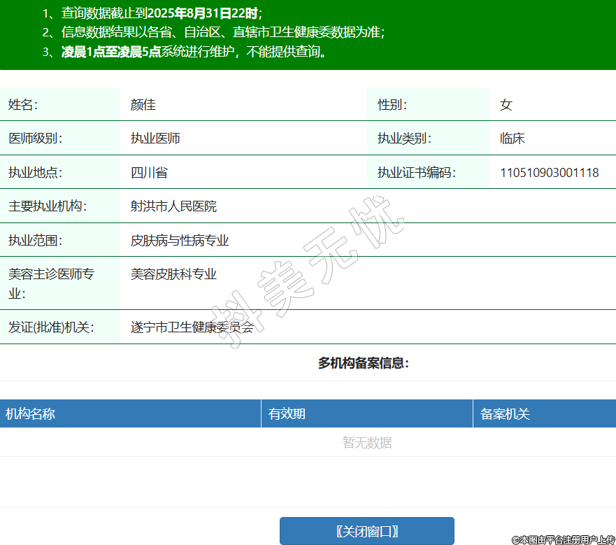姓名:顏佳性別:女醫(yī)師級別:執(zhí)業(yè)醫(yī)師執(zhí)業(yè)類別:臨床執(zhí)業(yè)地點:四川省執(zhí)業(yè)證書編碼:110510903001118主要執(zhí)業(yè)機構(gòu):射洪市人民醫(yī)院執(zhí)業(yè)范圍:皮膚病與性病專業(yè)美容主診醫(yī)師專業(yè):美容皮膚科專業(yè)發(fā)證(批準)機關(guān):遂寧市衛(wèi)生健康委員會 -