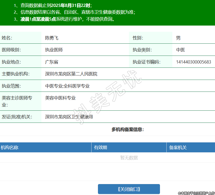 姓名:陳勇飛性別:男醫(yī)師級別:執(zhí)業(yè)醫(yī)師執(zhí)業(yè)類別:中醫(yī)執(zhí)業(yè)地點:廣東省執(zhí)業(yè)證書編碼:141440300005683主要執(zhí)業(yè)機(jī)構(gòu):深圳市龍崗區(qū)第二人民醫(yī)院執(zhí)業(yè)范圍:中醫(yī)專業(yè);全科醫(yī)學(xué)專業(yè)美容主診醫(yī)師專業(yè):美容中醫(yī)科專業(yè)發(fā)證(批準(zhǔn))機(jī)關(guān):深圳市龍崗區(qū)衛(wèi)生健康局 -