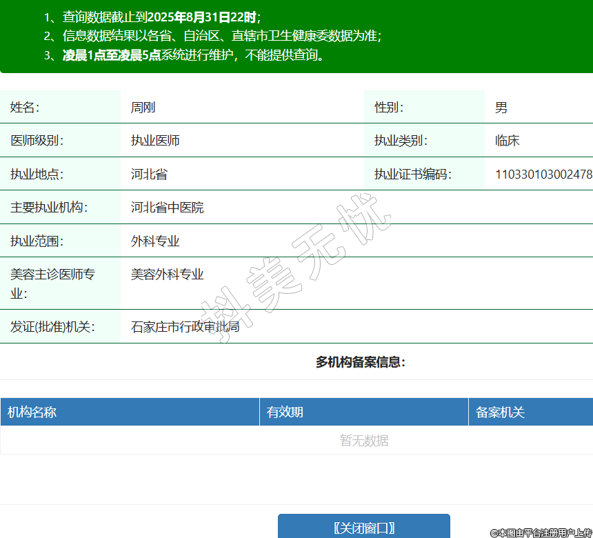 姓名:周剛性別:男醫(yī)師級別:執(zhí)業(yè)醫(yī)師執(zhí)業(yè)類別:臨床執(zhí)業(yè)地點:河北省執(zhí)業(yè)證書編碼:110330103002478主要執(zhí)業(yè)機構:河北省中醫(yī)院執(zhí)業(yè)范圍:外科專業(yè)美容主診醫(yī)師專業(yè):美容外科專業(yè)發(fā)證(批準)機關:石家莊市行政審批局 -