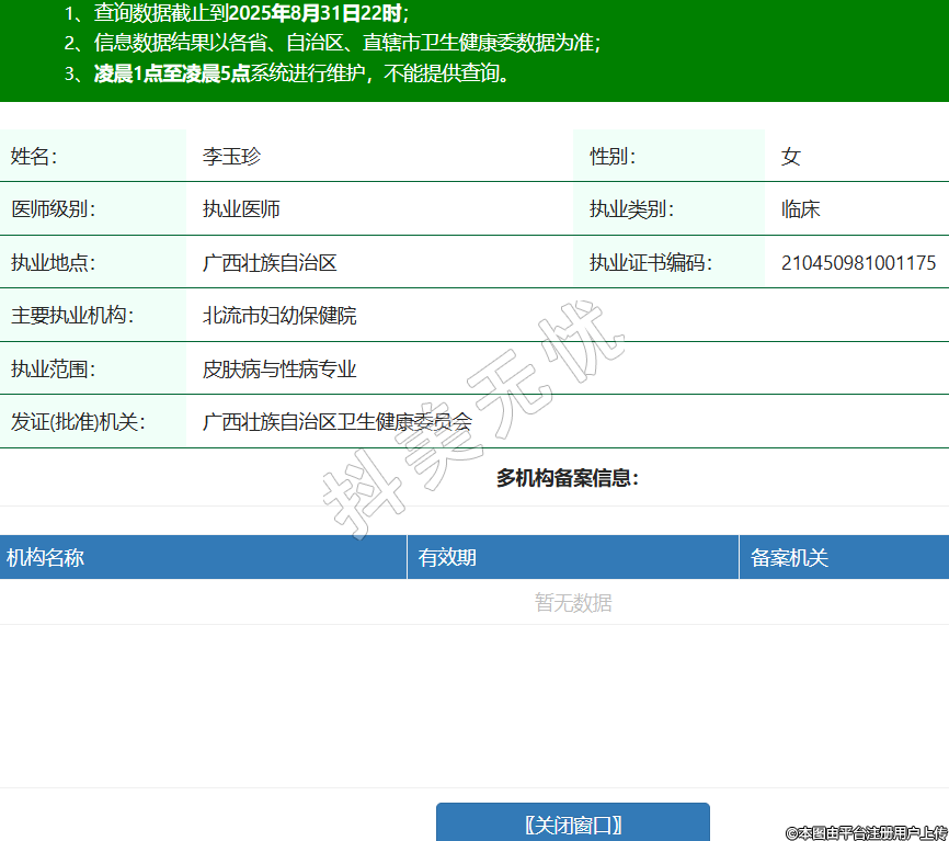 姓名:李玉珍性別:女醫(yī)師級別:執(zhí)業(yè)醫(yī)師執(zhí)業(yè)類別:臨床執(zhí)業(yè)地點:廣西壯族自治區(qū)執(zhí)業(yè)證書編碼:210450981001175主要執(zhí)業(yè)機構:北流市婦幼保健院執(zhí)業(yè)范圍:皮膚病與性病專業(yè)發(fā)證(批準)機關:廣西壯族自治區(qū)衛(wèi)生健康委員會 -