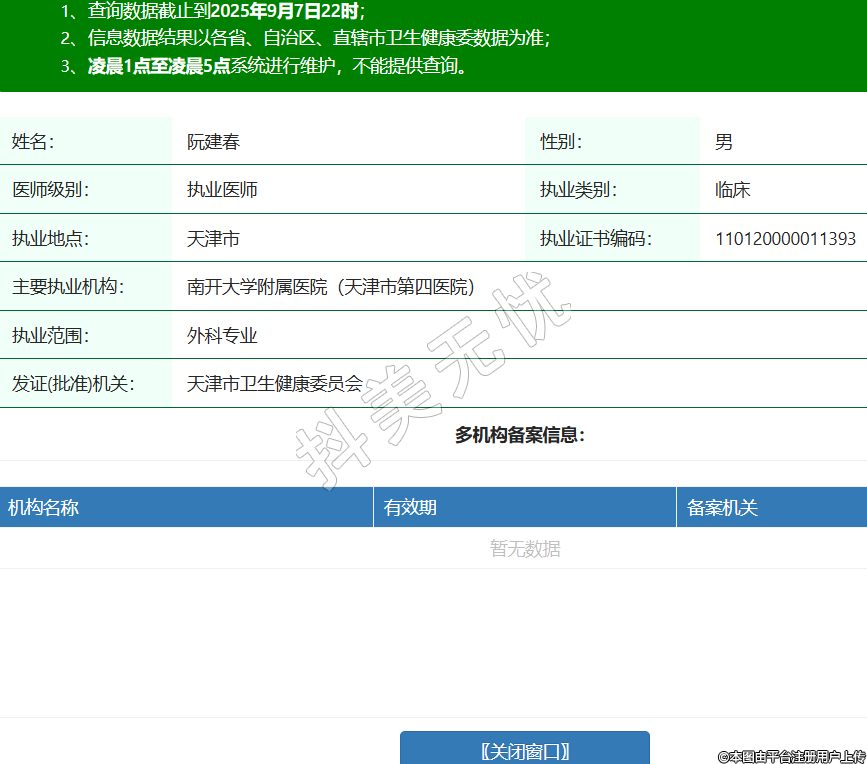 姓名:阮建春性別:男醫(yī)師級別:執(zhí)業(yè)醫(yī)師執(zhí)業(yè)類別:臨床執(zhí)業(yè)地點(diǎn):天津市執(zhí)業(yè)證書編碼:110120000011393主要執(zhí)業(yè)機(jī)構(gòu):南開大學(xué)附屬醫(yī)院(天津市第四醫(yī)院)執(zhí)業(yè)范圍:外科專業(yè)發(fā)證(批準(zhǔn))機(jī)關(guān):天津市衛(wèi)生健康委員會(huì) -