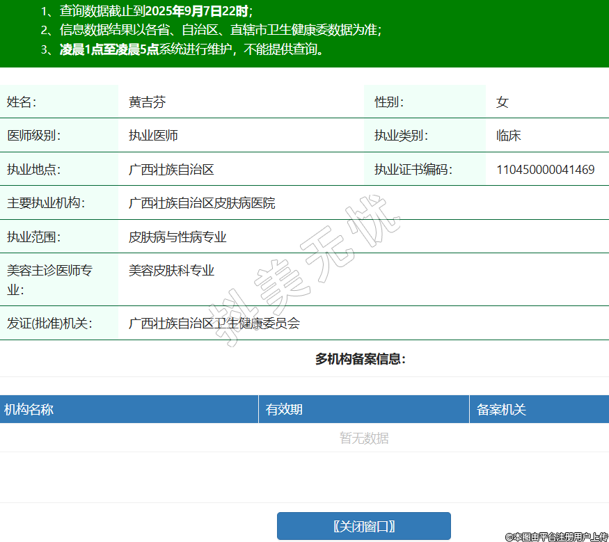 姓名:黃吉芬性別:女醫(yī)師級別:執(zhí)業(yè)醫(yī)師執(zhí)業(yè)類別:臨床執(zhí)業(yè)地點:廣西壯族自治區(qū)執(zhí)業(yè)證書編碼:110450000041469主要執(zhí)業(yè)機構:廣西壯族自治區(qū)皮膚病醫(yī)院執(zhí)業(yè)范圍:皮膚病與性病專業(yè)美容主診醫(yī)師專業(yè):美容皮膚科專業(yè)發(fā)證(批準)機關:廣西壯族自治區(qū)衛(wèi)生健康委員會 -