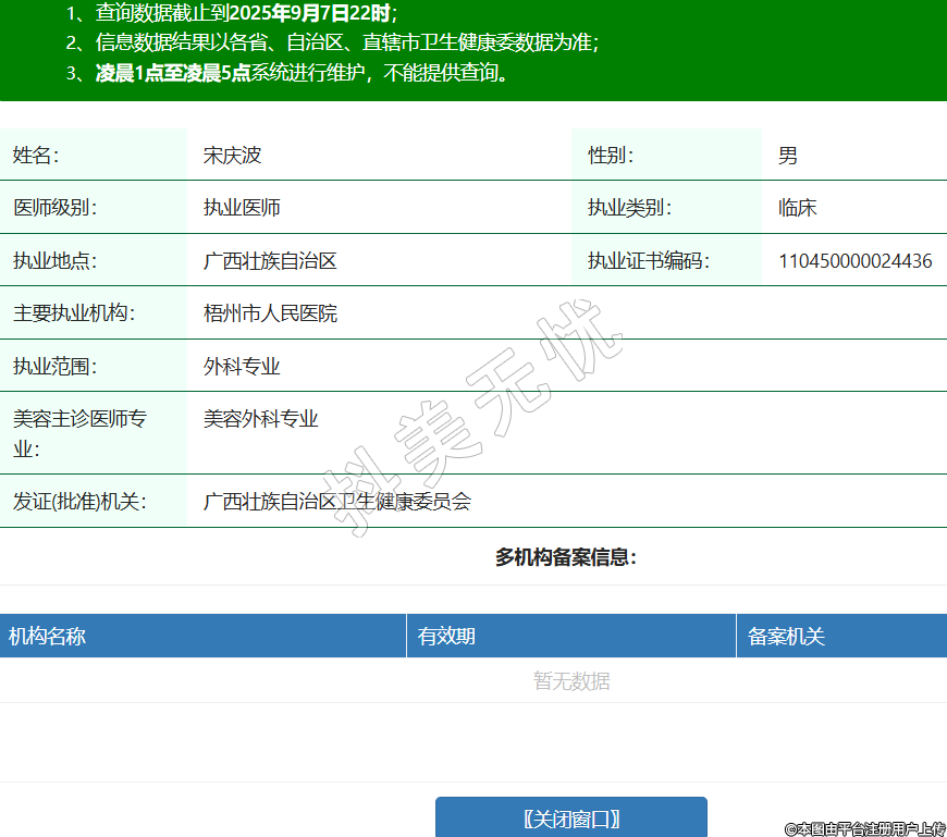 姓名:宋慶波性別:男醫(yī)師級(jí)別:執(zhí)業(yè)醫(yī)師執(zhí)業(yè)類(lèi)別:臨床執(zhí)業(yè)地點(diǎn):廣西壯族自治區(qū)執(zhí)業(yè)證書(shū)編碼:110450000024436主要執(zhí)業(yè)機(jī)構(gòu):梧州市人民醫(yī)院執(zhí)業(yè)范圍:外科專(zhuān)業(yè)美容主診醫(yī)師專(zhuān)業(yè):美容外科專(zhuān)業(yè)發(fā)證(批準(zhǔn))機(jī)關(guān):廣西壯族自治區(qū)衛(wèi)生健康委員會(huì) -