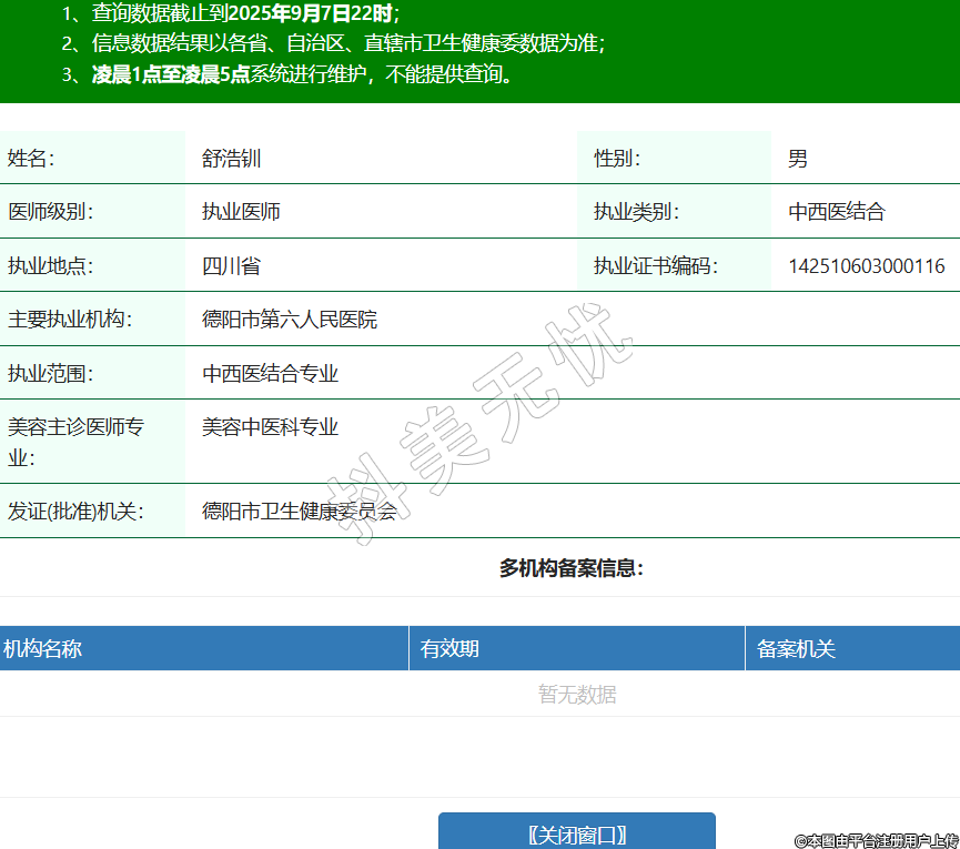 姓名:舒浩釧性別:男醫(yī)師級(jí)別:執(zhí)業(yè)醫(yī)師執(zhí)業(yè)類別:中西醫(yī)結(jié)合執(zhí)業(yè)地點(diǎn):四川省執(zhí)業(yè)證書編碼:142510603000116主要執(zhí)業(yè)機(jī)構(gòu):德陽(yáng)市第六人民醫(yī)院執(zhí)業(yè)范圍:中西醫(yī)結(jié)合專業(yè)美容主診醫(yī)師專業(yè):美容中醫(yī)科專業(yè)發(fā)證(批準(zhǔn))機(jī)關(guān):德陽(yáng)市衛(wèi)生健康委員會(huì) -