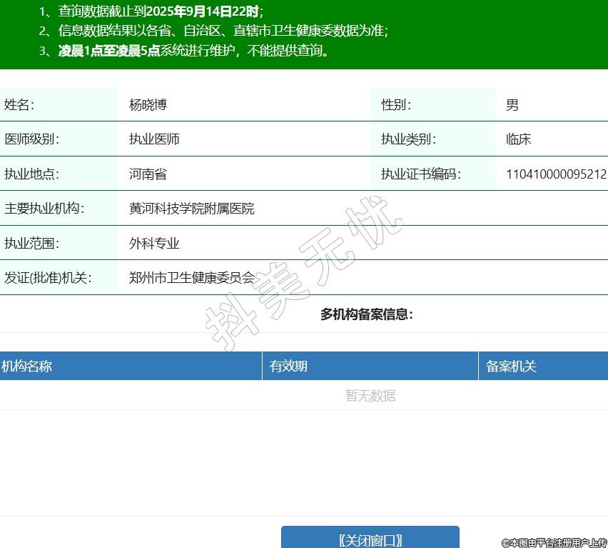 姓名:楊曉博性別:男醫(yī)師級(jí)別:執(zhí)業(yè)醫(yī)師執(zhí)業(yè)類別:臨床執(zhí)業(yè)地點(diǎn):河南省執(zhí)業(yè)證書(shū)編碼:110410000095212主要執(zhí)業(yè)機(jī)構(gòu):黃河科技學(xué)院附屬醫(yī)院執(zhí)業(yè)范圍:外科專業(yè)發(fā)證(批準(zhǔn))機(jī)關(guān):鄭州市衛(wèi)生健康委員會(huì) -