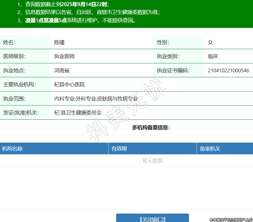 姓名:陳瑾性別:女醫(yī)師級別:執(zhí)業(yè)醫(yī)師執(zhí)業(yè)類別:臨床執(zhí)業(yè)地點:河南省執(zhí)業(yè)證書編碼:210410221000546主要執(zhí)業(yè)機構(gòu):杞縣中心醫(yī)院執(zhí)業(yè)范圍:內(nèi)科專業(yè);外科專業(yè);皮膚病與性病專業(yè)發(fā)證(批準)機關(guān):杞 縣衛(wèi)生健康委員會 -