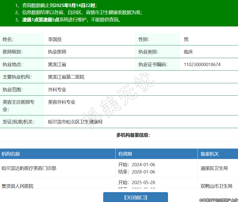 姓名:李國良性別:男醫(yī)師級別:執(zhí)業(yè)醫(yī)師執(zhí)業(yè)類別:臨床執(zhí)業(yè)地點:黑龍江省執(zhí)業(yè)證書編碼:110230000018674主要執(zhí)業(yè)機構(gòu):黑龍江省第二醫(yī)院執(zhí)業(yè)范圍:外科專業(yè)美容主診醫(yī)師專業(yè):美容外科專業(yè)發(fā)證(批準)機關(guān):哈爾濱市松北區(qū)衛(wèi)生健康局多機構(gòu)備案信息:機構(gòu)名稱 有效期 備案機關(guān) 哈爾濱達嶼醫(yī)療美容門診部 開始:2024-01-06結(jié)束:2028-01-06道里區(qū)衛(wèi)生局 集賢縣人民醫(yī)院 開始:2025-05-28結(jié)束:2026-05-27雙鴨山市衛(wèi)生局 -