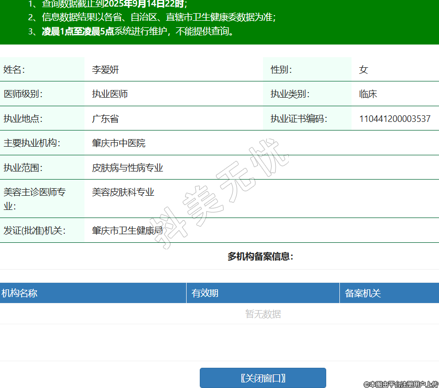 姓名:李愛(ài)妍性別:女醫(yī)師級(jí)別:執(zhí)業(yè)醫(yī)師執(zhí)業(yè)類別:臨床執(zhí)業(yè)地點(diǎn):廣東省執(zhí)業(yè)證書(shū)編碼:110441200003537主要執(zhí)業(yè)機(jī)構(gòu):肇慶市中醫(yī)院執(zhí)業(yè)范圍:皮膚病與性病專業(yè)美容主診醫(yī)師專業(yè):美容皮膚科專業(yè)發(fā)證(批準(zhǔn))機(jī)關(guān):肇慶市衛(wèi)生健康局 -