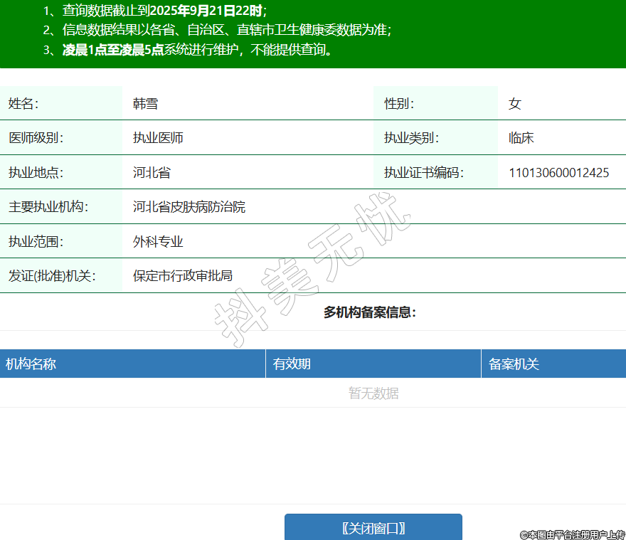 姓名:韓雪性別:女醫(yī)師級別:執(zhí)業(yè)醫(yī)師執(zhí)業(yè)類別:臨床執(zhí)業(yè)地點:河北省執(zhí)業(yè)證書編碼:110130600012425主要執(zhí)業(yè)機構:河北省皮膚病防治院執(zhí)業(yè)范圍:外科專業(yè)發(fā)證(批準)機關:保定市行政審批局 -