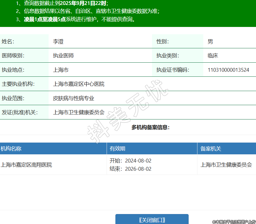 姓名:李澄性別:男醫(yī)師級別:執(zhí)業(yè)醫(yī)師執(zhí)業(yè)類別:臨床執(zhí)業(yè)地點:上海市執(zhí)業(yè)證書編碼:110310000013524主要執(zhí)業(yè)機構(gòu):上海市嘉定區(qū)中心醫(yī)院執(zhí)業(yè)范圍:皮膚病與性病專業(yè)發(fā)證(批準)機關(guān):上海市衛(wèi)生健康委員會多機構(gòu)備案信息:機構(gòu)名稱 有效期 備案機關(guān) 上海市嘉定區(qū)南翔醫(yī)院 開始:2024-08-02結(jié)束:2026-08-02上海市衛(wèi)生健康委員會 -