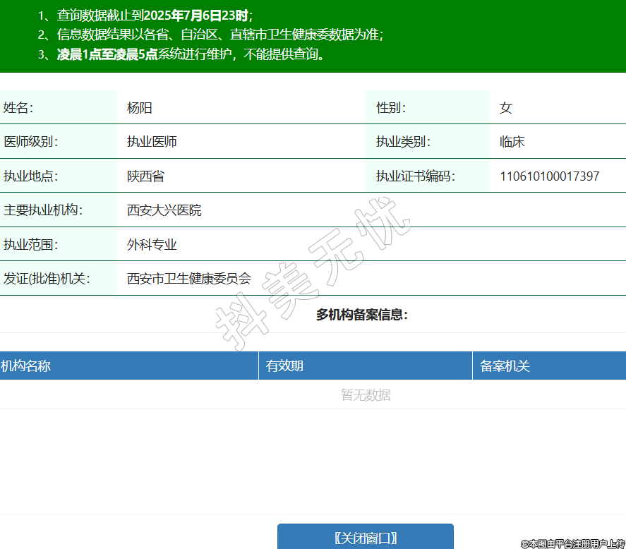 姓名:楊陽(yáng)性別:女醫(yī)師級(jí)別:執(zhí)業(yè)醫(yī)師執(zhí)業(yè)類別:臨床執(zhí)業(yè)地點(diǎn):陜西省執(zhí)業(yè)證書編碼:110610100017397主要執(zhí)業(yè)機(jī)構(gòu):西安大興醫(yī)院執(zhí)業(yè)范圍:外科專業(yè)發(fā)證(批準(zhǔn))機(jī)關(guān):西安市衛(wèi)生健康委員會(huì) -