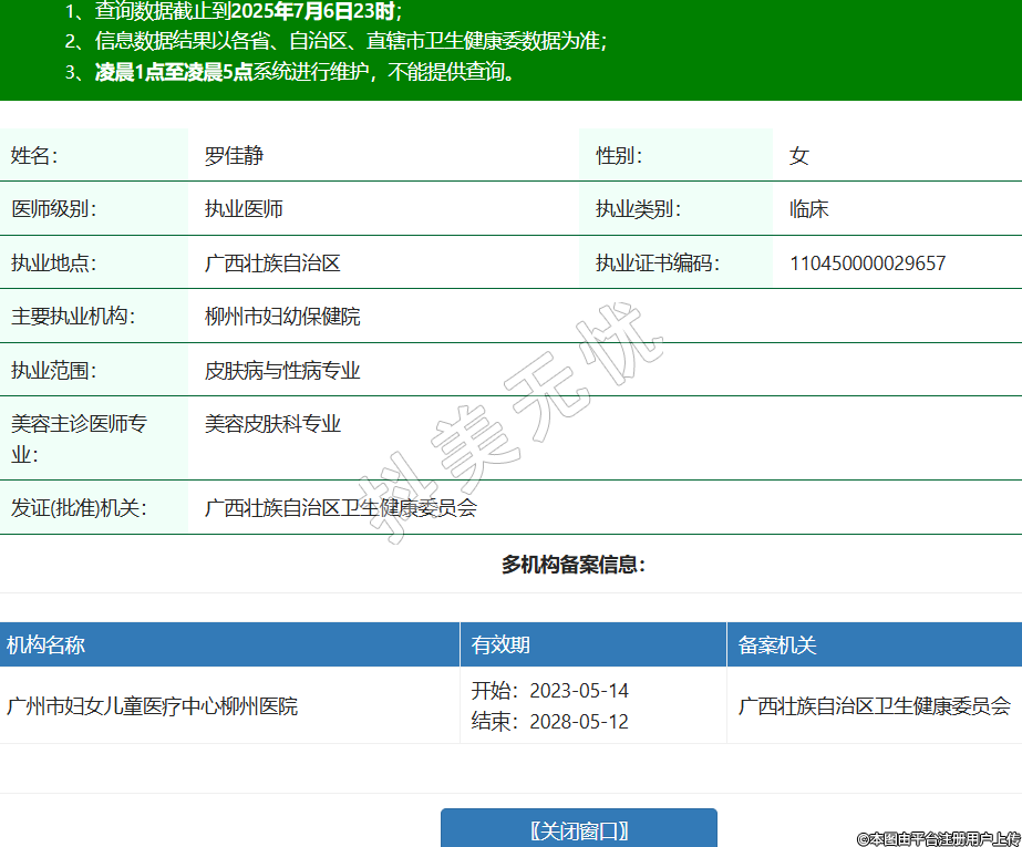 姓名:羅佳靜性別:女醫(yī)師級(jí)別:執(zhí)業(yè)醫(yī)師執(zhí)業(yè)類別:臨床執(zhí)業(yè)地點(diǎn):廣西壯族自治區(qū)執(zhí)業(yè)證書編碼:110450000029657主要執(zhí)業(yè)機(jī)構(gòu):柳州市婦幼保健院執(zhí)業(yè)范圍:皮膚病與性病專業(yè)美容主診醫(yī)師專業(yè):美容皮膚科專業(yè)發(fā)證(批準(zhǔn))機(jī)關(guān):廣西壯族自治區(qū)衛(wèi)生健康委員會(huì)多機(jī)構(gòu)備案信息:機(jī)構(gòu)名稱 有效期 備案機(jī)關(guān) 廣州市婦女兒童醫(yī)療中心柳州醫(yī)院 開(kāi)始:2023-05-14結(jié)束:2028-05-12廣西壯族自治區(qū)衛(wèi)生健康委員會(huì) -