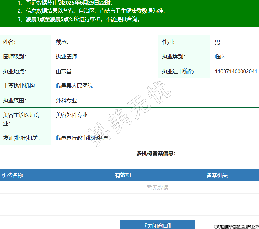 姓名:戴承旺性別:男醫(yī)師級別:執(zhí)業(yè)醫(yī)師執(zhí)業(yè)類別:臨床執(zhí)業(yè)地點:山東省執(zhí)業(yè)證書編碼:110371400002041主要執(zhí)業(yè)機構(gòu):臨邑縣人民醫(yī)院執(zhí)業(yè)范圍:外科專業(yè)美容主診醫(yī)師專業(yè):美容外科專業(yè)發(fā)證(批準)機關:臨邑縣行政審批服務局 -
