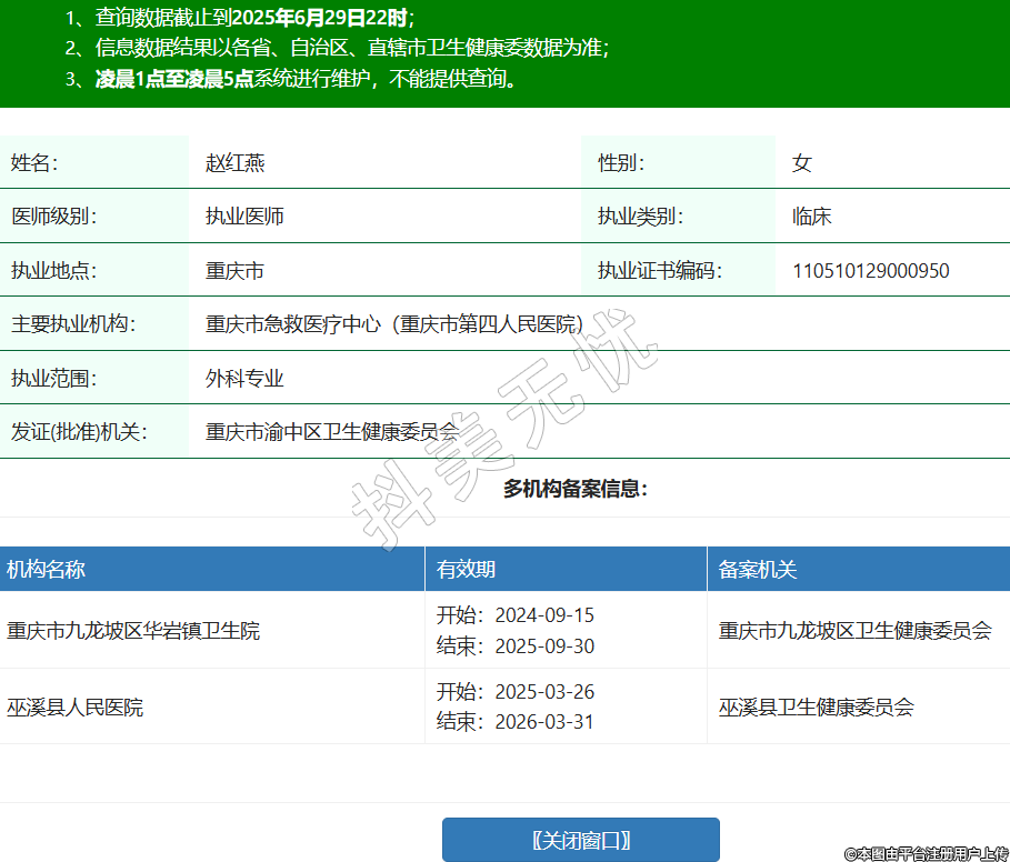 姓名:趙紅燕性別:女醫(yī)師級別:執(zhí)業(yè)醫(yī)師執(zhí)業(yè)類別:臨床執(zhí)業(yè)地點:重慶市執(zhí)業(yè)證書編碼:110510129000950主要執(zhí)業(yè)機構(gòu):重慶市急救醫(yī)療中心(重慶市第四人民醫(yī)院)執(zhí)業(yè)范圍:外科專業(yè)發(fā)證(批準(zhǔn))機關(guān):重慶市渝中區(qū)衛(wèi)生健康委員會多機構(gòu)備案信息:機構(gòu)名稱 有效期 備案機關(guān) 重慶市九龍坡區(qū)華巖鎮(zhèn)衛(wèi)生院 開始:2024-09-15結(jié)束:2025-09-30重慶市九龍坡區(qū)衛(wèi)生健康委員會 巫溪縣人民醫(yī)院 開始:2025-03-26結(jié)束:2026-03-31巫溪縣衛(wèi)生健康委員會 -