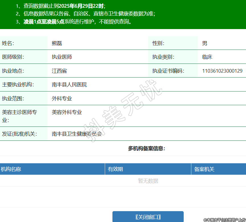 姓名:熊磊性別:男醫(yī)師級別:執(zhí)業(yè)醫(yī)師執(zhí)業(yè)類別:臨床執(zhí)業(yè)地點:江西省執(zhí)業(yè)證書編碼:110361023000129主要執(zhí)業(yè)機構(gòu):南豐縣人民醫(yī)院執(zhí)業(yè)范圍:外科專業(yè)美容主診醫(yī)師專業(yè):美容外科專業(yè)發(fā)證(批準(zhǔn))機關(guān):南豐縣衛(wèi)生健康委員會 -
