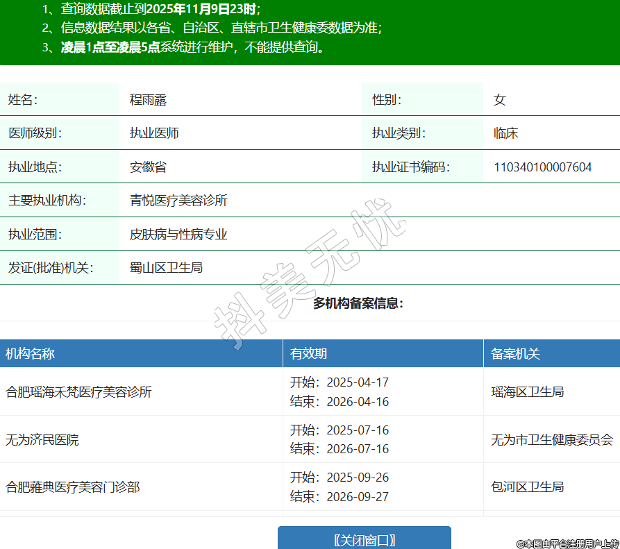 姓名:程雨露性別:女醫(yī)師級別:執(zhí)業(yè)醫(yī)師執(zhí)業(yè)類別:臨床執(zhí)業(yè)地點(diǎn):安徽省執(zhí)業(yè)證書編碼:110340100007604主要執(zhí)業(yè)機(jī)構(gòu):青悅醫(yī)療美容診所執(zhí)業(yè)范圍:皮膚病與性病專業(yè)發(fā)證(批準(zhǔn))機(jī)關(guān):蜀山區(qū)衛(wèi)生局多機(jī)構(gòu)備案信息:機(jī)構(gòu)名稱 有效期 備案機(jī)關(guān) 合肥瑤海禾梵醫(yī)療美容診所 開始:2025-04-17結(jié)束:2026-04-16瑤海區(qū)衛(wèi)生局 無為濟(jì)民醫(yī)院 開始:2025-07-16結(jié)束:2026-07-16無為市衛(wèi)生健康委員會 合肥蕥典醫(yī)療美容門診部 開始:2025-09-26結(jié)束:2026-09-27包河區(qū)衛(wèi)生局 蜀山艾蓓緹醫(yī)療美容診所 開始:2025-10-11結(jié)束:2026-11-10蜀山區(qū)衛(wèi)生局 -