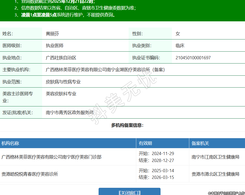 姓名:黃麗芬性別:女醫(yī)師級(jí)別:執(zhí)業(yè)醫(yī)師執(zhí)業(yè)類別:臨床執(zhí)業(yè)地點(diǎn):廣西壯族自治區(qū)執(zhí)業(yè)證書編碼:210450100001697主要執(zhí)業(yè)機(jī)構(gòu):廣西格林美菲醫(yī)療美容有限公司南寧金湖醫(yī)療美容診所(備案)執(zhí)業(yè)范圍:皮膚病與性病專業(yè)美容主診醫(yī)師專業(yè):美容皮膚科專業(yè)發(fā)證(批準(zhǔn))機(jī)關(guān):南寧市青秀區(qū)政務(wù)服務(wù)局多機(jī)構(gòu)備案信息:機(jī)構(gòu)名稱 有效期 備案機(jī)關(guān) 廣西格林美菲醫(yī)療美容有限公司南寧醫(yī)療美容門診部 開始:2024-11-29結(jié)束:2028-12-27南寧市江南區(qū)衛(wèi)生健康局 貴港皓悅悅青春醫(yī)療美容診所 開始:2025-03-14結(jié)束:2026-03-15貴港市港北區(qū)衛(wèi)生健康局 -