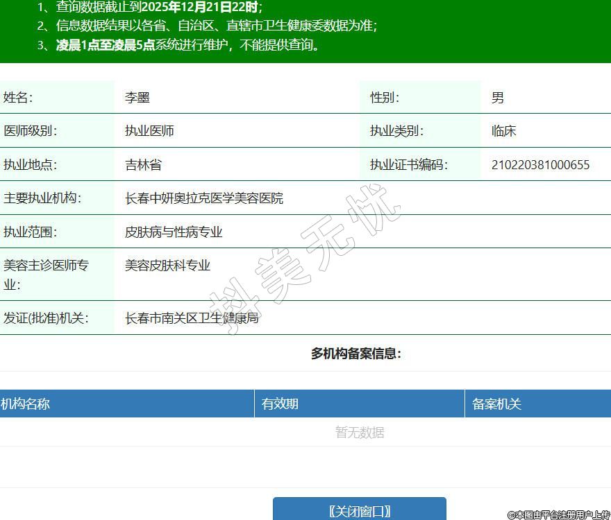 姓名:李墨性別:男醫(yī)師級別:執(zhí)業(yè)醫(yī)師執(zhí)業(yè)類別:臨床執(zhí)業(yè)地點:吉林省執(zhí)業(yè)證書編碼:210220381000655主要執(zhí)業(yè)機構:長春中妍奧拉克醫(yī)學美容醫(yī)院執(zhí)業(yè)范圍:皮膚病與性病專業(yè)美容主診醫(yī)師專業(yè):美容皮膚科專業(yè)發(fā)證(批準)機關:長春市南關區(qū)衛(wèi)生健康局 -