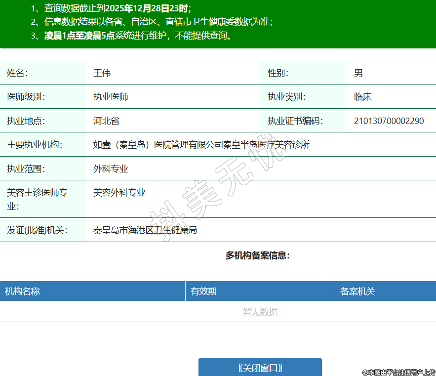 姓名:王偉性別:男醫(yī)師級別:執(zhí)業(yè)醫(yī)師執(zhí)業(yè)類別:臨床執(zhí)業(yè)地點:河北省執(zhí)業(yè)證書編碼:210130700002290主要執(zhí)業(yè)機構(gòu):如壹(秦皇島)醫(yī)院管理有限公司秦皇半島醫(yī)療美容診所執(zhí)業(yè)范圍:外科專業(yè)美容主診醫(yī)師專業(yè):美容外科專業(yè)發(fā)證(批準)機關(guān):秦皇島市海港區(qū)衛(wèi)生健康局 -