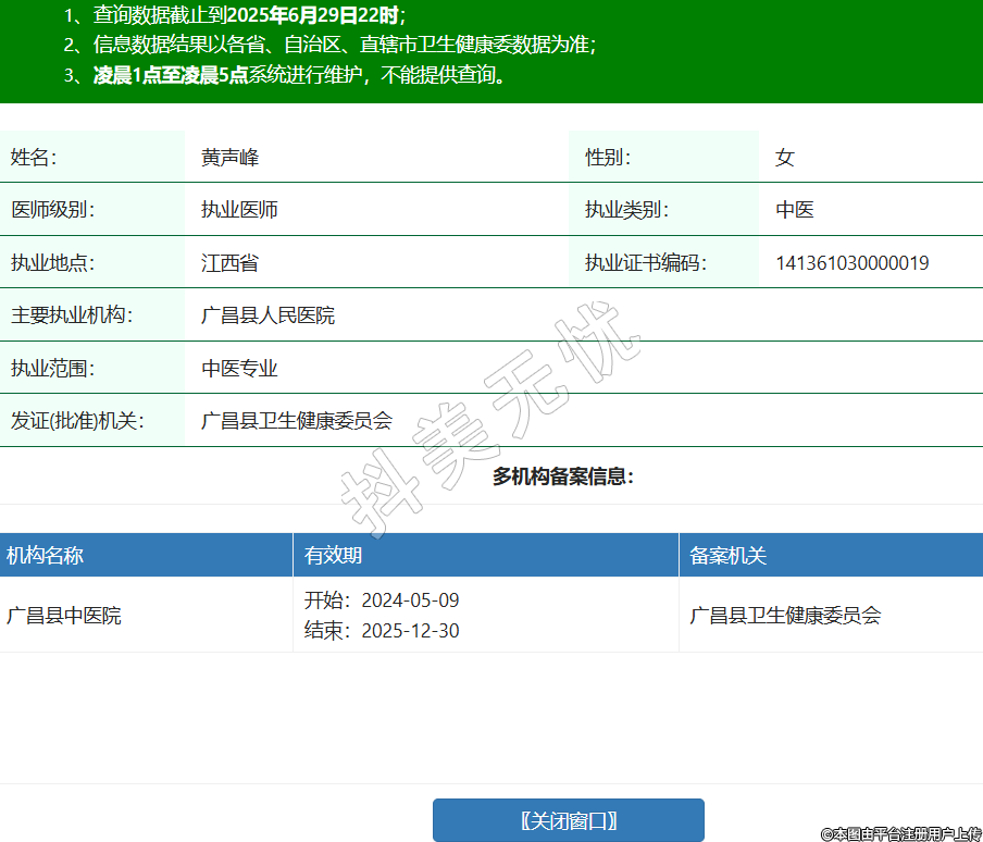 姓名:黃聲峰性別:女醫(yī)師級(jí)別:執(zhí)業(yè)醫(yī)師執(zhí)業(yè)類(lèi)別:中醫(yī)執(zhí)業(yè)地點(diǎn):江西省執(zhí)業(yè)證書(shū)編碼:141361030000019主要執(zhí)業(yè)機(jī)構(gòu):廣昌縣人民醫(yī)院執(zhí)業(yè)范圍:中醫(yī)專(zhuān)業(yè)發(fā)證(批準(zhǔn))機(jī)關(guān):廣昌縣衛(wèi)生健康委員會(huì)多機(jī)構(gòu)備案信息:機(jī)構(gòu)名稱(chēng) 有效期 備案機(jī)關(guān) 廣昌縣中醫(yī)院 開(kāi)始:2024-05-09結(jié)束:2025-12-30廣昌縣衛(wèi)生健康委員會(huì) -
