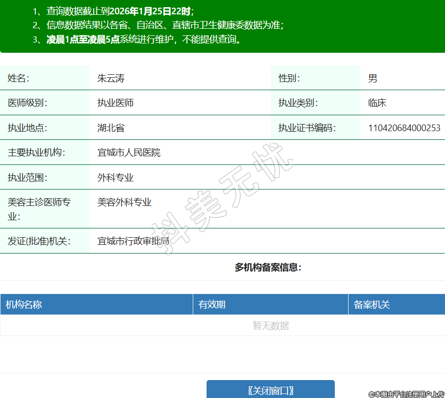 姓名:朱云濤性別:男醫(yī)師級(jí)別:執(zhí)業(yè)醫(yī)師執(zhí)業(yè)類別:臨床執(zhí)業(yè)地點(diǎn):湖北省執(zhí)業(yè)證書(shū)編碼:110420684000253主要執(zhí)業(yè)機(jī)構(gòu):宜城市人民醫(yī)院執(zhí)業(yè)范圍:外科專業(yè)美容主診醫(yī)師專業(yè):美容外科專業(yè)發(fā)證(批準(zhǔn))機(jī)關(guān):宜城市行政審批局 -