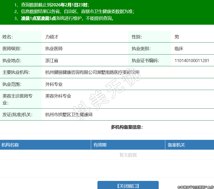 姓名:力碩才性別:男醫(yī)師級別:執(zhí)業(yè)醫(yī)師執(zhí)業(yè)類別:臨床執(zhí)業(yè)地點:浙江省執(zhí)業(yè)證書編碼:110140100011281主要執(zhí)業(yè)機構(gòu):杭州健麗健康咨詢有限公司湖墅南路醫(yī)療美容診所執(zhí)業(yè)范圍:外科專業(yè)美容主診醫(yī)師專業(yè):美容外科專業(yè)發(fā)證(批準)機關:杭州市拱墅區(qū)衛(wèi)生健康局 -