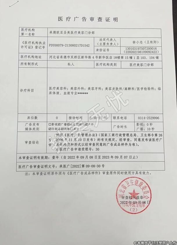 診療科目:醫(yī)療美容科;美容外科;美容牙科;美容皮膚科/麻醉科/醫(yī)學(xué)檢驗(yàn)科;臨床體液、血液專業(yè)******