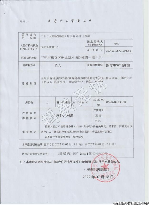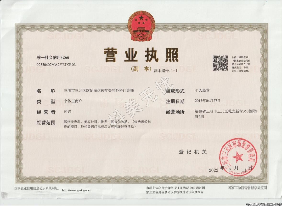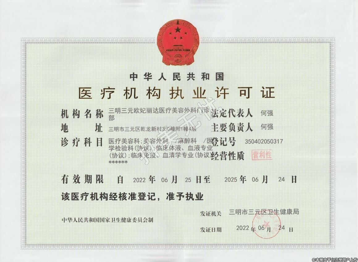 機(jī)構(gòu)名稱:三明三元?dú)W妃麗達(dá)醫(yī)療美容外科門診部
