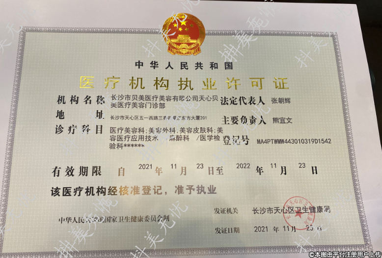 機(jī)構(gòu)名稱:長沙市貝美醫(yī)療美容有限公司天心貝美醫(yī)療美容門診部。
